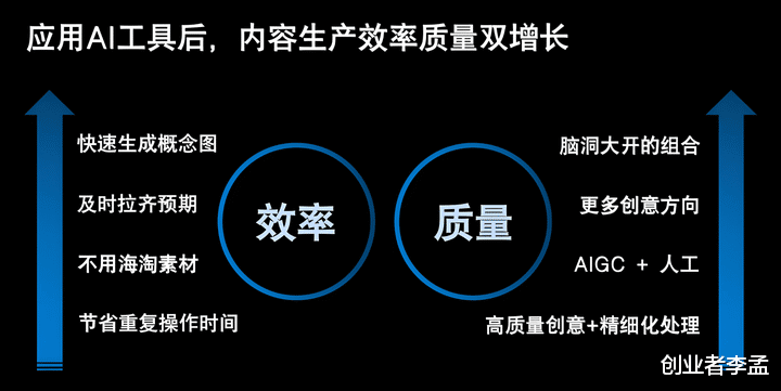 而AIGC伴随着自媒体创作、文案创作、零售辅助等等产业,很多的企业需要效率,甚至还为了降本增效,已经把全人工的文案都辞退了。或者减少了文案创作比例、设计师的比例、视频剪辑的比例,让现有的人学ai、用AI,然后把AI当做他们的助理一起来创作,这是一些懂得情况下的高效率!
